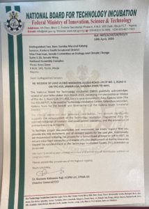 In a letter dated April 14, 2025, the Director General of NBTI, Dr. Kazeem Kolawole Raji, acknowledged receipt of Senator Katung’s earlier correspondence and lauded the Senator’s “generous contribution,” noting that it would enhance the Technology Incubation Programme (TIP) and support broader federal innovation efforts.