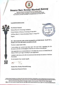 In a significant step towards boosting innovation and economic development in Southern Kaduna, Senator Barr. Sunday Marshall Katung has formally facilitated the release of a prime land parcel along Madakiya Access Road in Jama’a Local Government Area to the National Board for Technology Incubation (NBTI).
